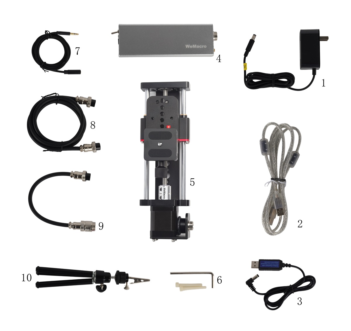 We provide a power bank cable for free in the package.This cable and a power bank will supply the controller.If you want to try stacking outside,it will help a lot! This part is a standard accessory in WeMacro rail package!Please notice the power bank itself is not included.